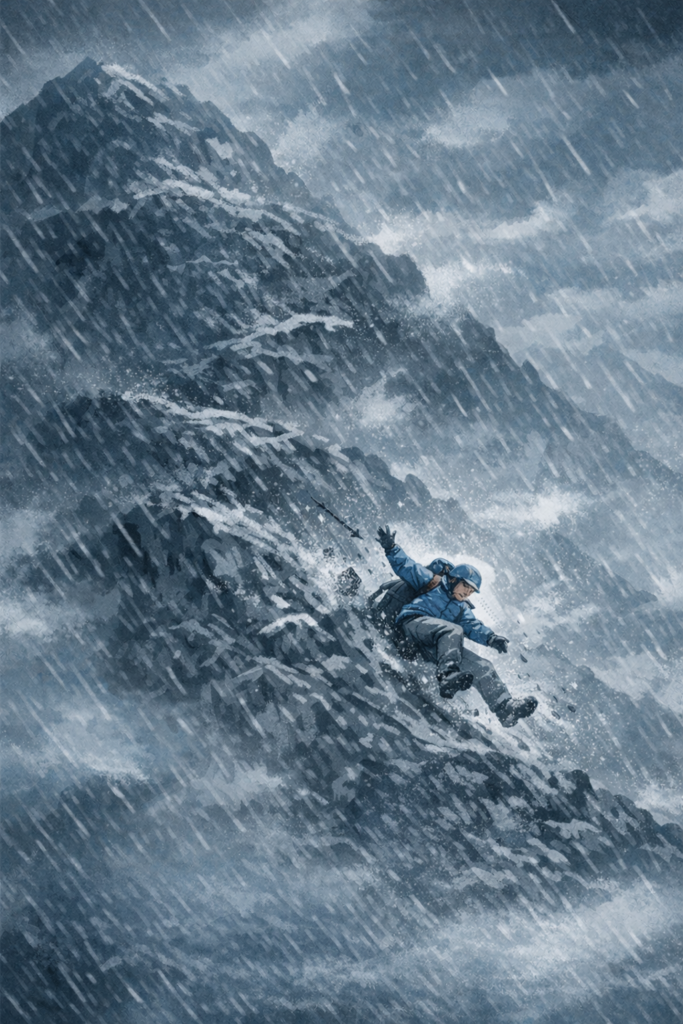 投資の失敗と迷いを象徴する登山の滑落イメージ